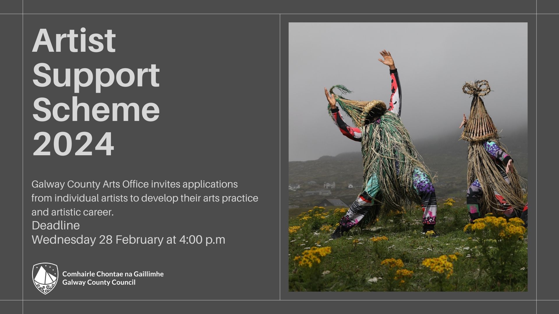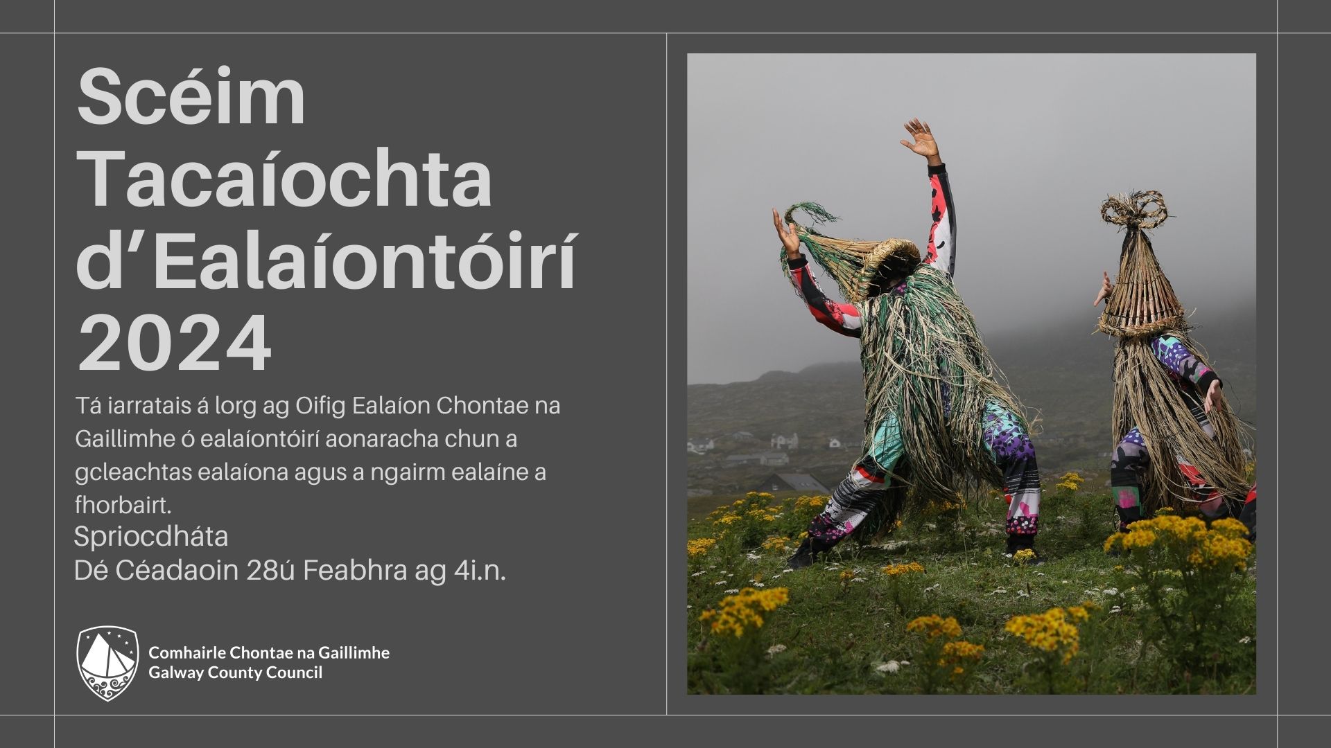 Tá iarratais á lorg ag Oifig Ealaíon Chontae na Gaillimhe ó ealaíontóirí aonaracha chun a gcleachtas ealaíona agus a ngairm ealaíne a fhorbairt. Spriocdháta Dé Céadaoin 28ú Feabhra 2024 ag 4:00 i.n.