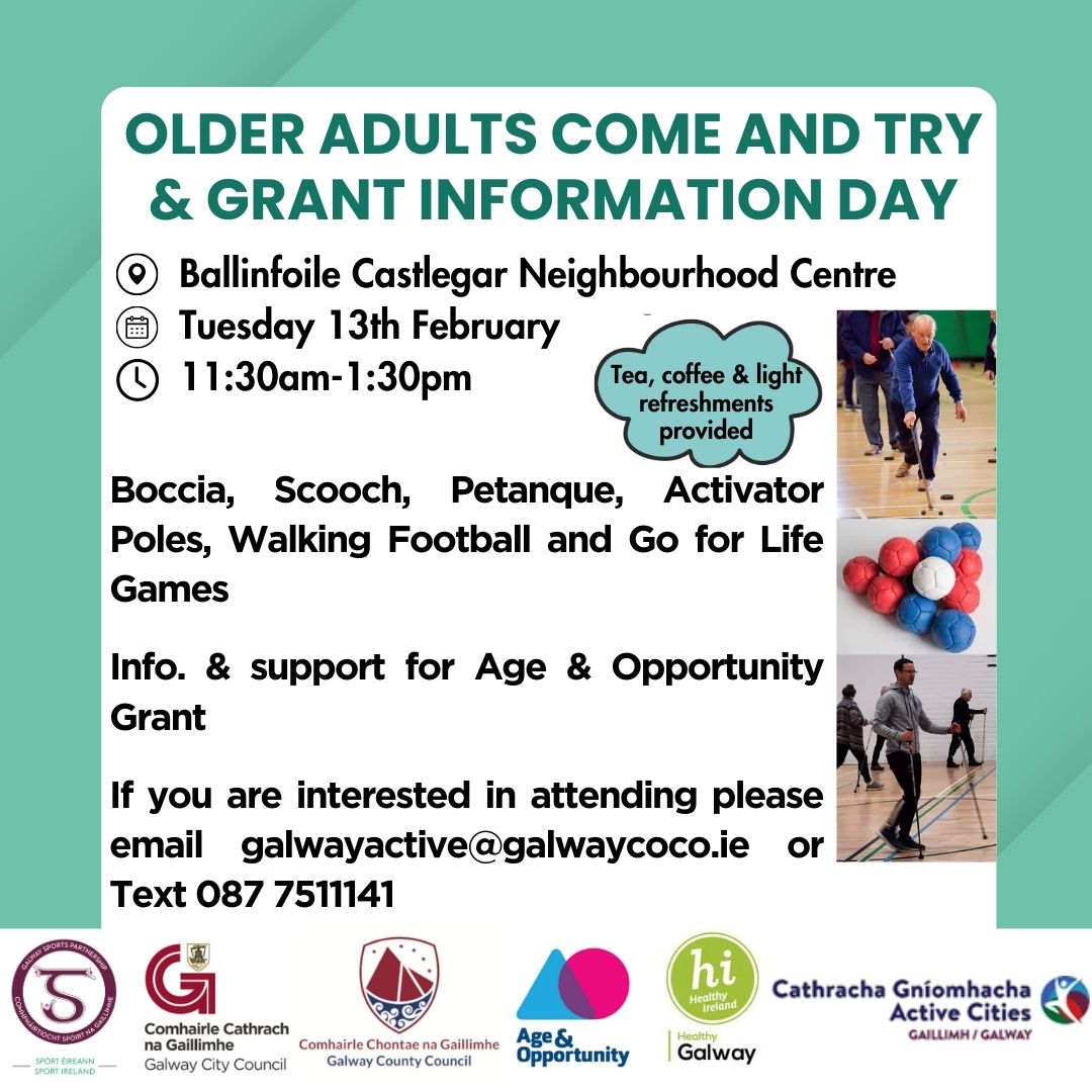 Galway Sports Partnership are hosting a ‘Come and Try & Grant Information Day’ where you can bring up to 5 members of your group to try out equipment and speak to staff of Galway County Council, Galway City Council, Healthy Galway and Active Cities. Activities include; Boccia, Scooch, Petanque, Activator Poles, Go For Life Games and more! There will also be information on the costings and where to purchase the various pieces of equipment demonstrated. Come and Try & Grant Information Day. Ballinfoile Castlegar Neighbourhood Centre (BCNC). Tuesday 13th February11:30am – 1:30pm. Tea, coffee and light refreshments provided. If you are interested in attending please respond to this email, or email galwayactive@galwaycoco.ie or Text 087 7511141