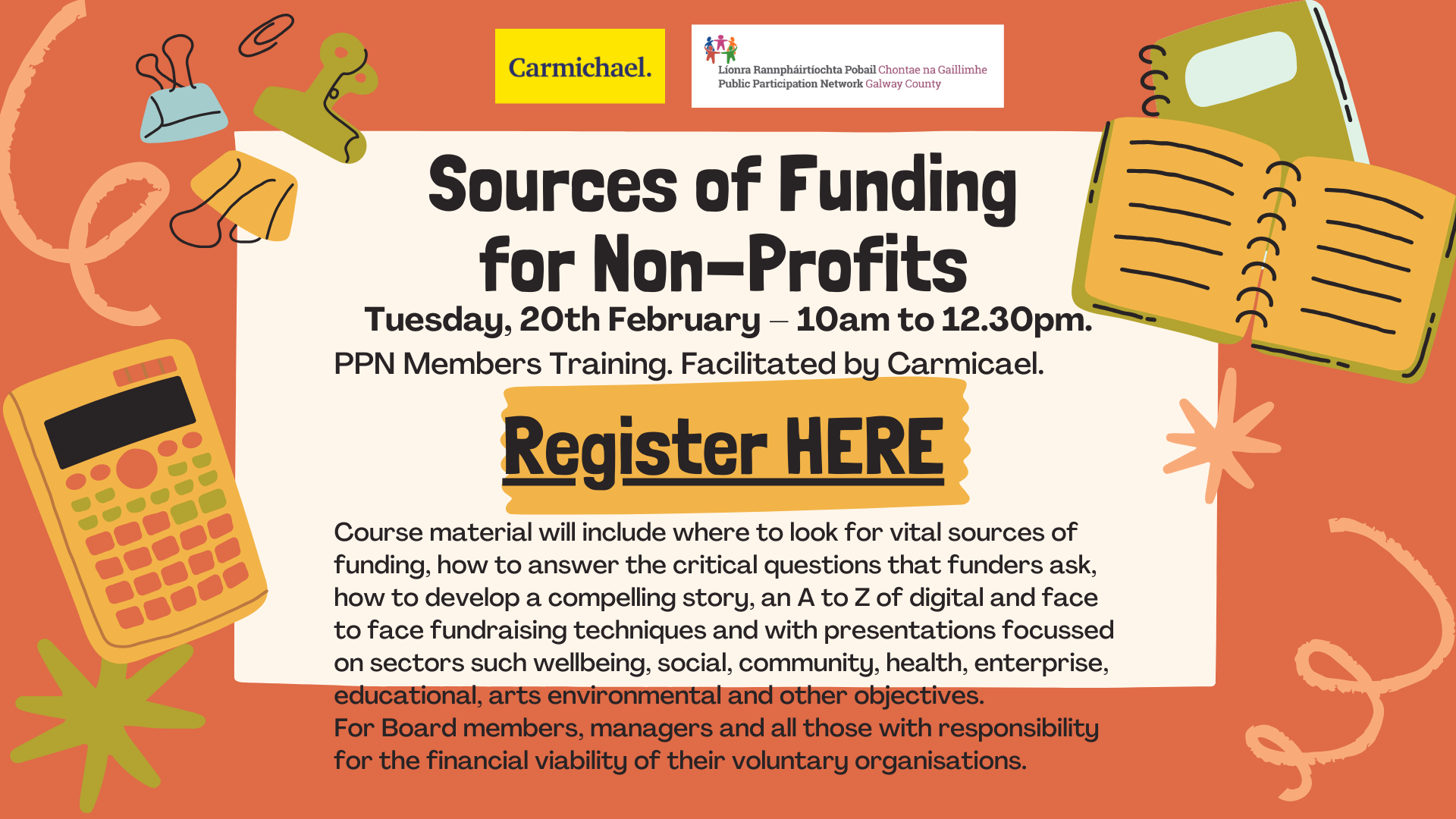 Sources of Funding for Non-Profits Tuesday, 20th February – 10am to 12.30pm, ONLINE via Zoom Course material will include where to look for vital sources of funding, how to answer the critical questions that funders ask, how to develop a compelling story, an A to Z of digital and face to face fundraising techniques and with presentations focused on sectors such wellbeing, social, community, health, enterprise, educational, arts environmental and other objectives. Register HERE.