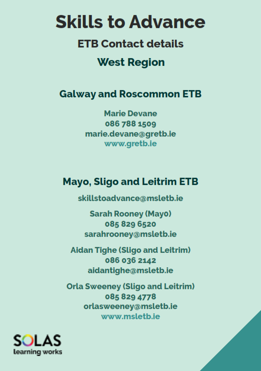 Do you struggle to access training and development for your staff? Your local Education and Training Board now offers a range of short, stackable micro-qualifications tailored to fit busy schedules and today’s most pressing skills needs. These innovative new programmes are offered through the Skills To Advance initiative which provides courses at little of no cost to employers and employees.